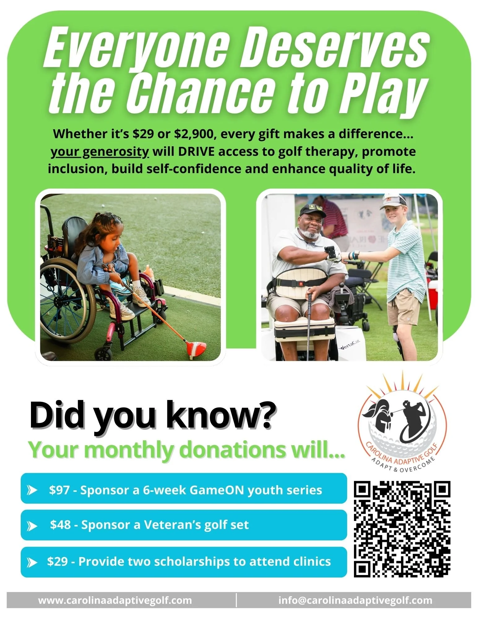 Our clinics deliver adaptive golf therapy to veterans, youth & adults with unique abilities. ~ Everyone Deserves the Chance to Play